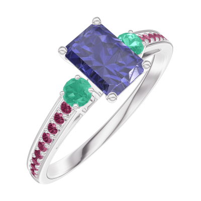 « L'ATELIER » Nº 163891Bague Or blanc 18 carats - Saphir bleu Rectangle 0.5 carat - Pierres de côté Émeraude - Sertissage Rubis