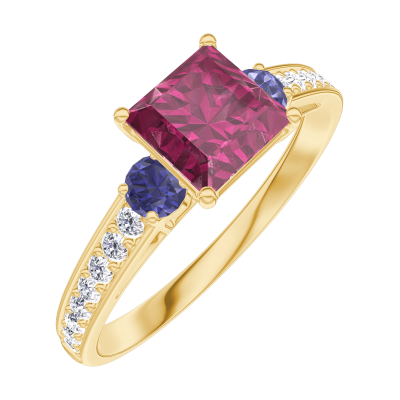 « L'ATELIER » Nº165565Bague Or jaune 18 carats - Rubis Princesse 0.7 carat - Pierres de côté Saphir bleu - Sertissage Diamant