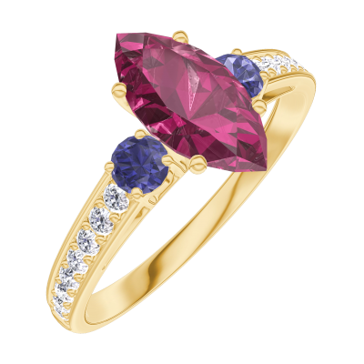 « L'ATELIER » Nº165965Bague Or jaune 18 carats - Rubis Marquise 0.7 carat - Pierres de côté Saphir bleu - Sertissage Diamant