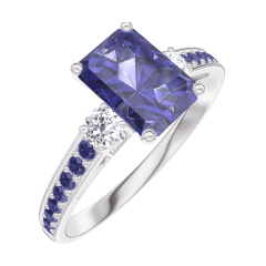 Pourquoi nous faire confiance ? « L'ATELIER » Nº 166236 Bague Or blanc 9 carats - Saphir bleu Rectangle 0.7 carat - Pierres de côté Diamant - Sertissage Saphir bleu