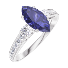 Pourquoi nous faire confiance ? « L'ATELIER » Nº 166528 Bague Or blanc 9 carats - Saphir bleu Marquise 0.7 carat - Pierres de côté Diamant - Sertissage Diamant
