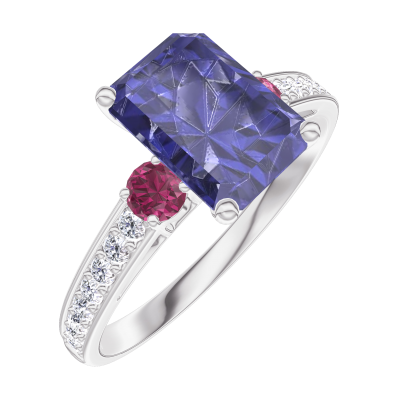 « L'ATELIER » Nº 168647Bague Or blanc 18 carats - Saphir bleu Rectangle 1 carat - Pierres de côté Rubis - Sertissage Diamant 4.6