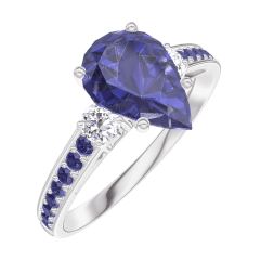 Bague Or blanc 18 carats - Saphir bleu Poire 1 carat - Pierres de côté Diamant - Sertissage Saphir bleu