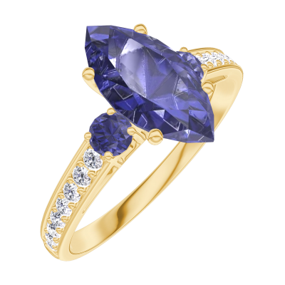 « L'ATELIER » Nº 168965Bague Or jaune 18 carats - Saphir bleu Marquise 1 carat - Pierres de côté Saphir bleu - Sertissage Diamant
