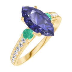 « L'ATELIER » Nº 168986Bague Or jaune 9 carats - Saphir bleu Marquise 1 carat - Pierres de côté Émeraude - Sertissage Diamant