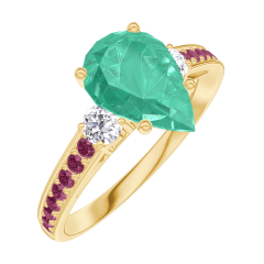 Bague Or jaune 9 carats - Émeraude Poire 1 carat - Pierres de côté Diamant - Sertissage Rubis