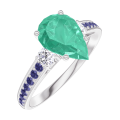 Bague Or blanc 18 carats - Émeraude Poire 1 carat - Pierres de côté Diamant - Sertissage Saphir bleu