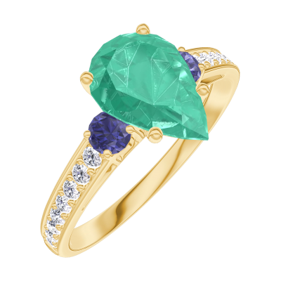 « L'ATELIER » Nº169466Bague Or jaune 9 carats - Émeraude Poire 1 carat - Pierres de côté Saphir bleu - Sertissage Diamant