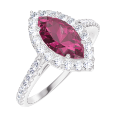 Pourquoi nous faire confiance ? « L'ATELIER » Nº 170536 Bague Or blanc 9 carats - Rubis Marquise 0.5 carat - Halo Diamant - Sertissage Diamant