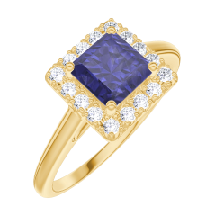 Bague Or jaune 9 carats - Saphir bleu Princesse 0.5 carat - Halo Diamant