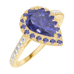 Pourquoi nous faire confiance ? « L'ATELIER » Nº 170806 Bague Or jaune 9 carats - Saphir bleu Poire 0.5 carat - Halo Saphir bleu - Sertissage Diamant