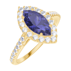 Bague Or jaune 9 carats - Saphir bleu Marquise 0.5 carat - Halo Diamant - Sertissage Diamant