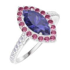 Pourquoi nous faire confiance ? « L'ATELIER » Nº 170840 Bague Or blanc 9 carats - Saphir bleu Marquise 0.5 carat - Halo Rubis - Sertissage Diamant
