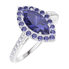 Pourquoi nous faire confiance ? « L'ATELIER » Nº 170856 Bague Or blanc 9 carats - Saphir bleu Marquise 0.5 carat - Halo Saphir bleu - Sertissage Diamant