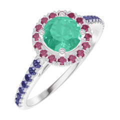 Pourquoi nous faire confiance ? « L'ATELIER » Nº 170896 Bague Or blanc 9 carats - Émeraude Rond 0.5 carat - Halo Rubis - Sertissage Saphir bleu