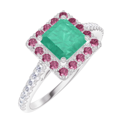 Bague Or blanc 18 carats - Émeraude Princesse 0.5 carat - Halo Rubis - Sertissage Diamant