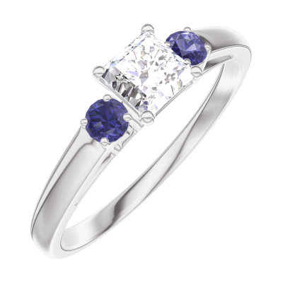 « L'ATELIER » Nº180164Bague Or blanc 9 carats - Diamant synthétique Princesse 0.3 carat - Pierres de côté Saphir bleu