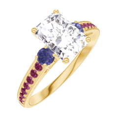 Bague Or jaune 18 carats - Diamant synthétique Rectangle 0.7 carat - Pierres de côté Saphir bleu - Sertissage Rubis