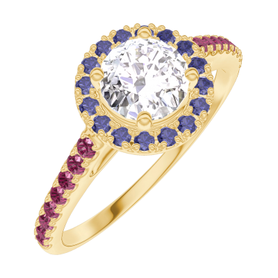 « L'ATELIER » Nº 190041Bague Or jaune 18 carats - Diamant synthétique Rond 0.5 carat - Halo Saphir bleu - Sertissage Rubis 5