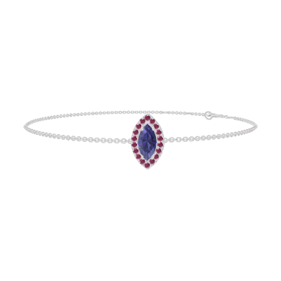 « L'ATELIER » Nº200755Bracelet Or blanc 18 carats - Saphir bleu Marquise 0.3 carat - Halo Rubis - Chaîne Forçat
