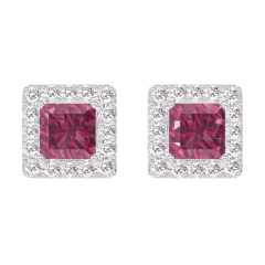 Boucles d'oreilles Or blanc 9 carats - Rubis Princesse 0.3 carat (2 X) - Halo Diamant