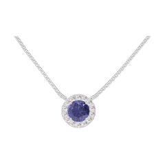 Collier Or blanc 9 carats - Saphir bleu Rond 0.3 carat - Halo Diamant - Chaîne Vénitienne