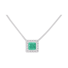 Collier Or blanc 18 carats - Émeraude Princesse 0.3 carat - Halo Diamant - Chaîne Vénitienne