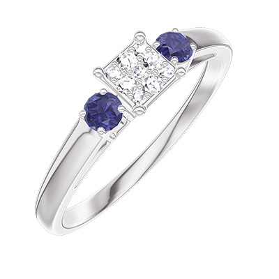 « L'ATELIER » Nº209164Bague Or blanc 9 carats - Cluster de diamants naturels Princesse équivalent 0.3 - Pierres de côté Saphir bleu