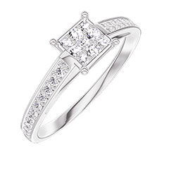 Pourquoi nous faire confiance ? « L'ATELIER » Nº 209708 Bague Or blanc 9 carats - Cluster de diamants naturels Princesse équivalent 0.5 - Sertissage Diamant