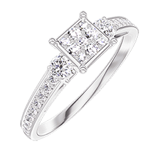 Pourquoi nous faire confiance ? « L'ATELIER » Nº 209728 Bague Or blanc 9 carats - Cluster de diamants naturels Princesse équivalent 0.5 - Pierres de côté Diamant - Sertissage Diamant