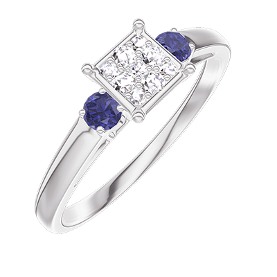 « L'ATELIER » Nº209764Bague Or blanc 9 carats - Cluster de diamants naturels Princesse équivalent 0.5 - Pierres de côté Saphir bleu