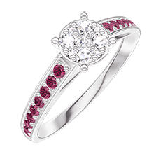 Pourquoi nous faire confiance ? « L'ATELIER » Nº 210212 Bague Or blanc 9 carats - Cluster de diamants naturels Rond équivalent 0.7 - Sertissage Rubis