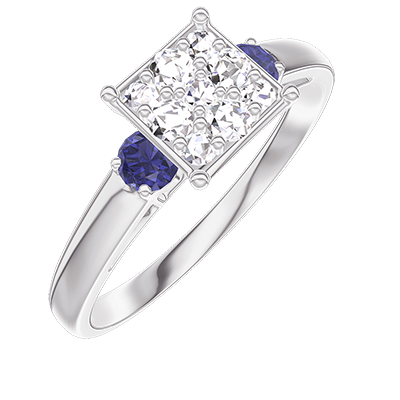 « L'ATELIER » Nº210963Bague Or blanc 18 carats - Cluster de diamants naturels Princesse équivalent 1 - Pierres de côté Saphir bleu