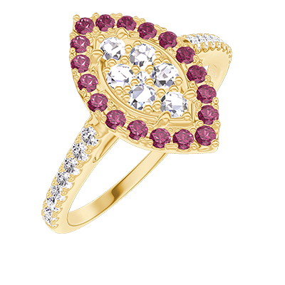 « L'ATELIER » Nº211662Bague Or jaune 9 carats - Cluster de diamants naturels Marquise équivalent 0.5 - Halo Rubis - Sertissage Diamant