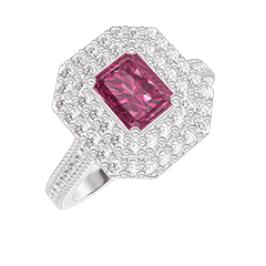 Bague Or blanc 9 carats - Rubis Rectangle 0.5 carat - Halo Diamant - Sertissage Diamant