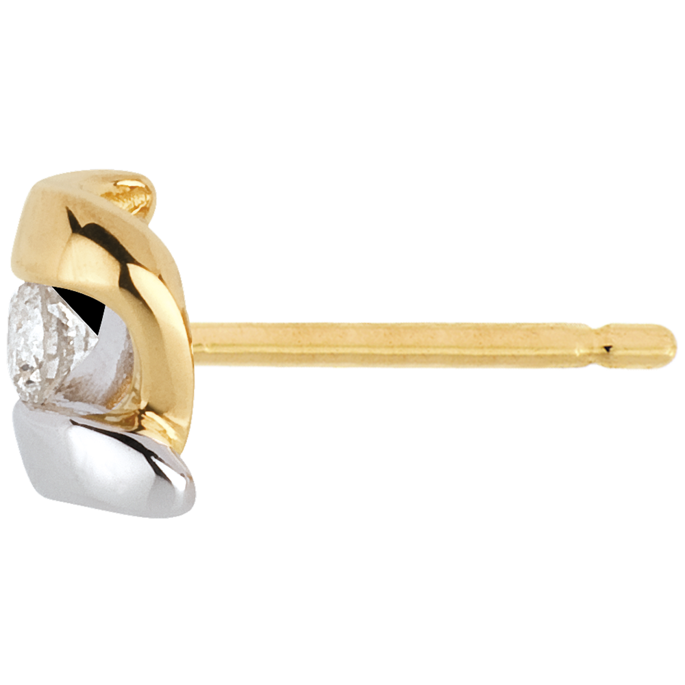 une virgule d'or jaune et une d'or blanc se rejoignent en nichant un diamant sur chaque boucle d'oreille