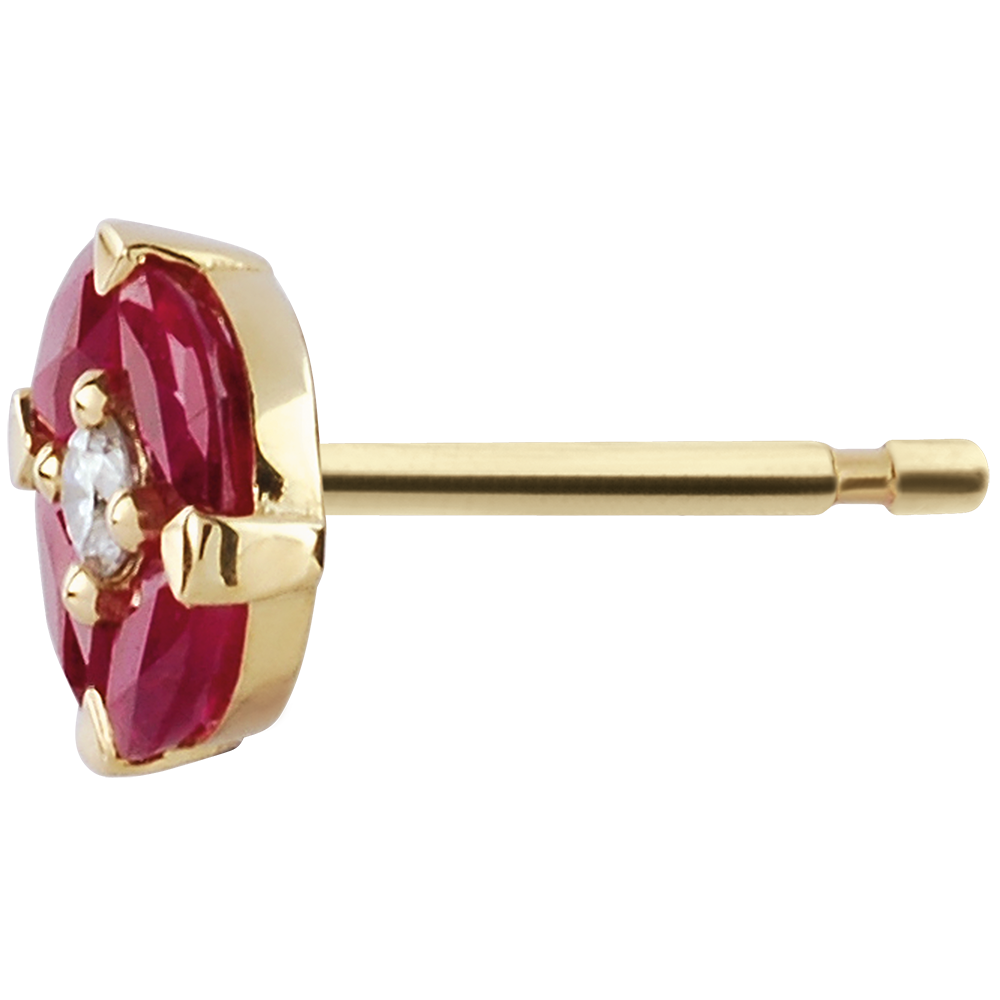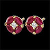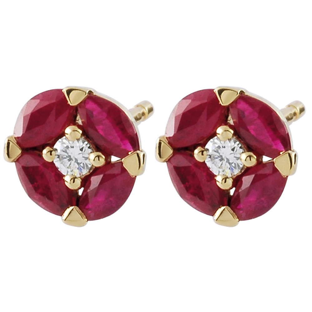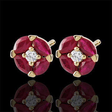 Diamants et rubis sertis dans l'or jaune dessinent ces boucles d'oreilles. 2 diamants : 0.05 carat - Or jaune (9 carats = 375/1000): 0.6 g. Rubis : 8 - Total: 0.76 caratPlus dimensions