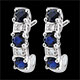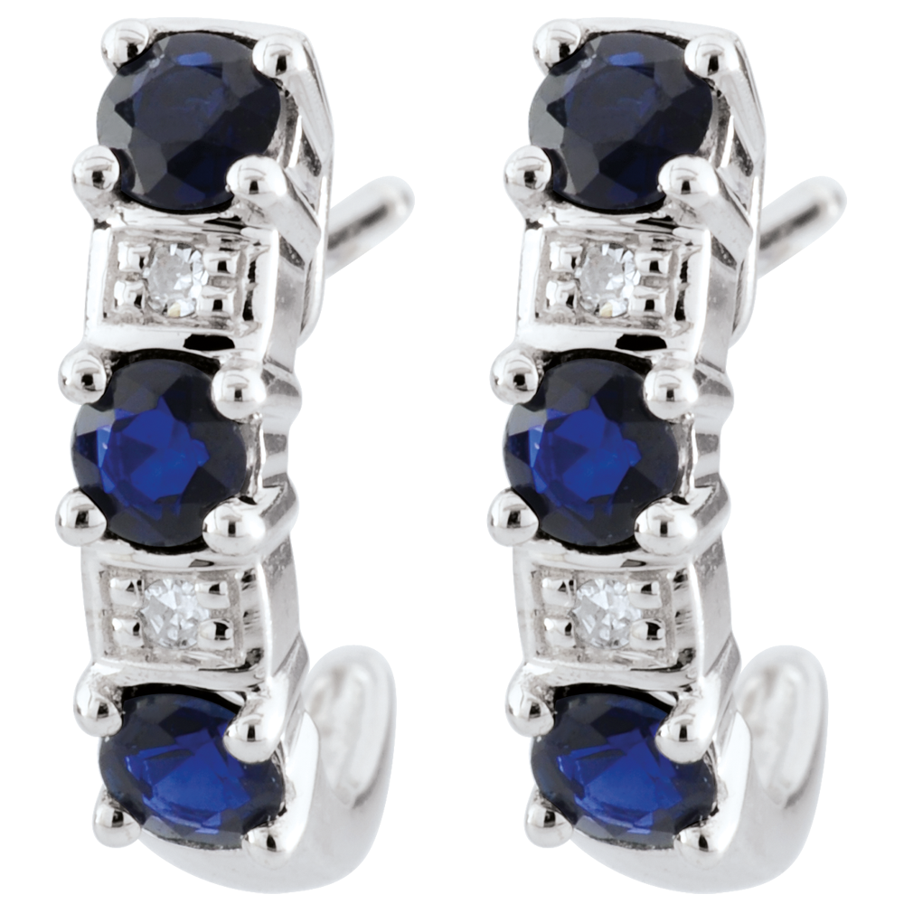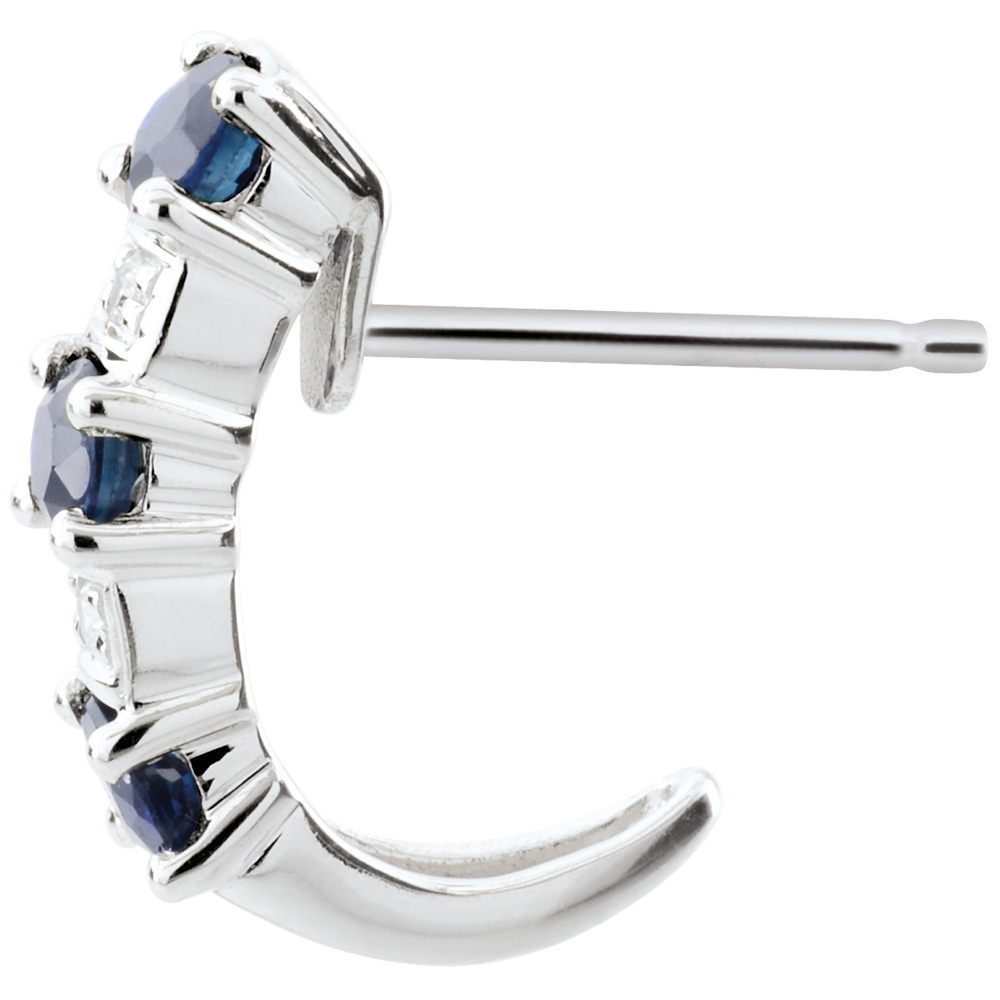 Des demi-créoles classiques et intemporelles, mêlant l'or, le diamant et le précieux saphir. 4 diamants : 0.02 carat - Or blanc (9 carats = 375/1000): 1.1 g. Saphir bleu : 6 - Total: 0.58 carat Plus dimensions