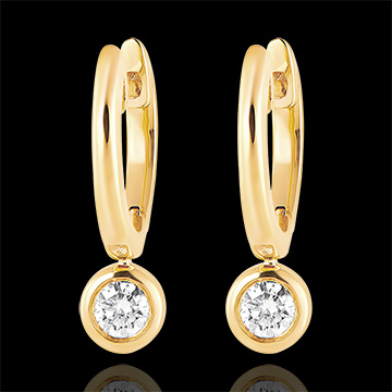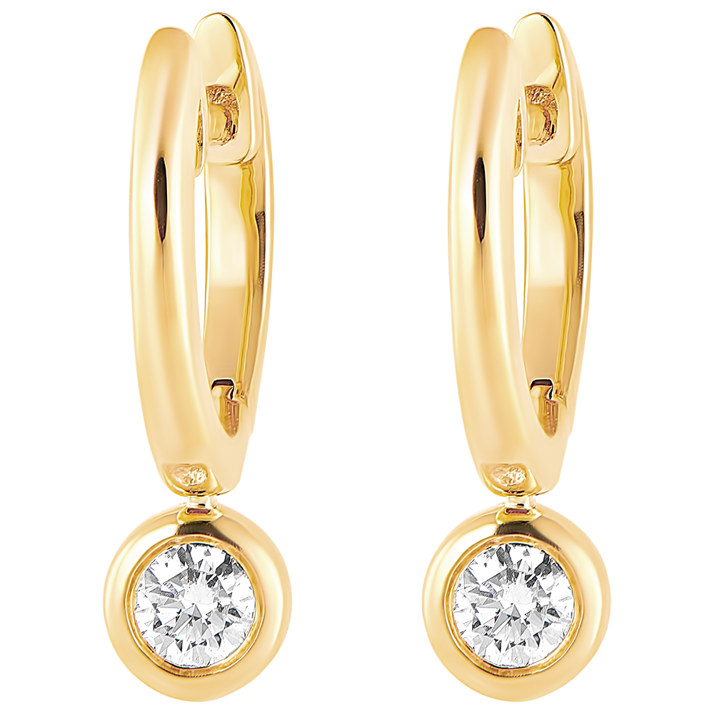 Une paire de créoles tout or jaune dont la pampille sertie diamant scintille délicatement à chaque mouvement.