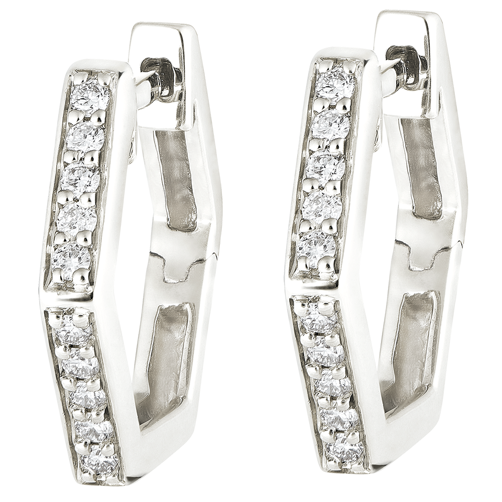 Une paire de créoles or blanc hexagonales serties de délicats diamants pour un effet graphique et moderne à la fois. Bijou fort de personnalité.