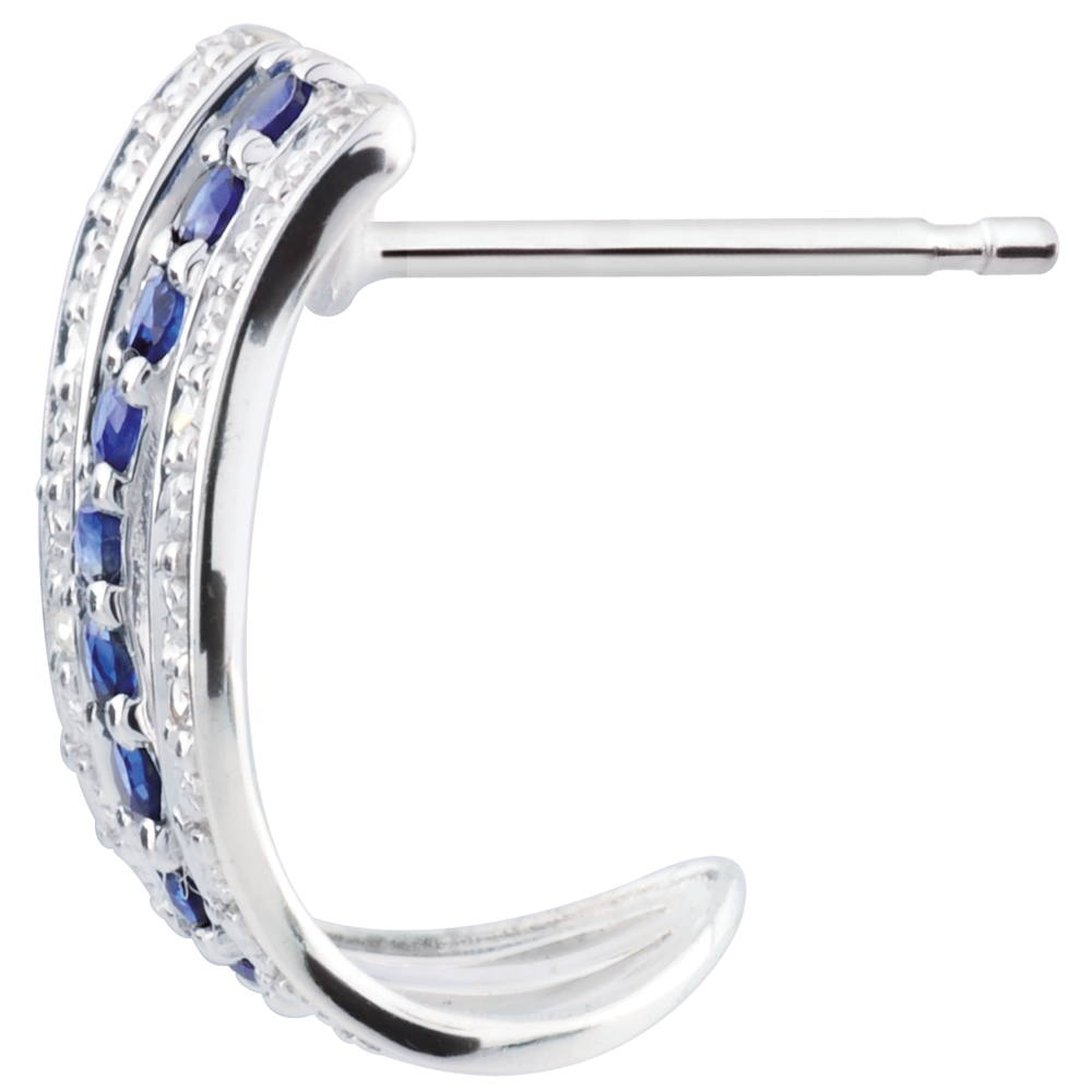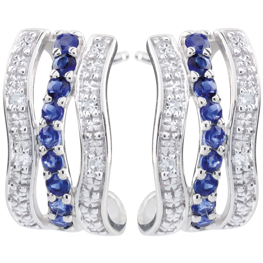 Une double vague de diamants encadre une onde de saphirs. Des créoles féminines, alliant classique et originalité.