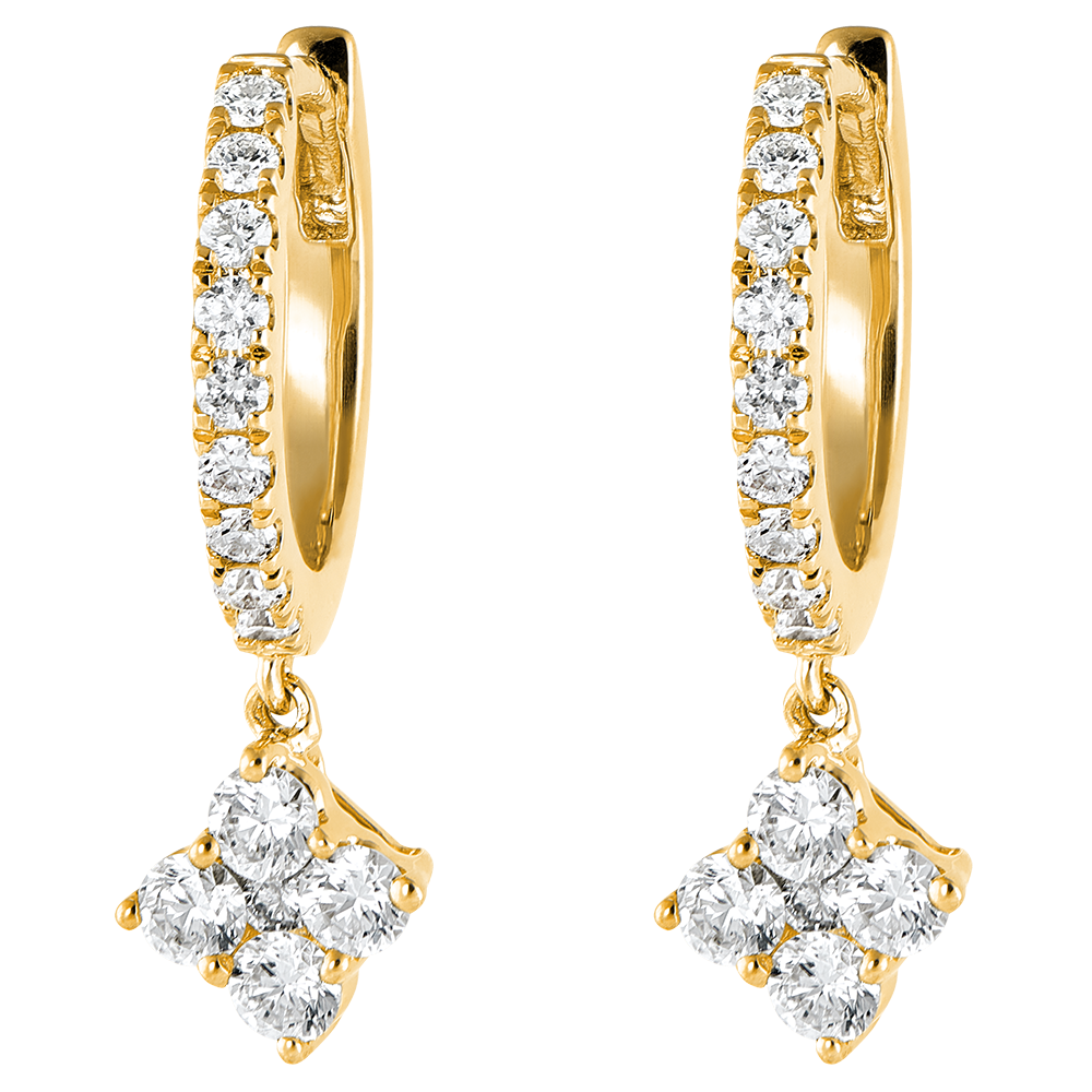 Une paire de créoles or jaune semi pavées diamants dont la pampille sertie d'un carré de 5 diamants ajoute une touche précieuse et moderne à la fois. Pampille de 5.95mm de coté et de 3.20mm d'épaisseur. 28 diamants : 0.38 carat - Or jaune (18 carats = 750/-): 1.7 g. Cluster de diamants naturels : 28 -Plus dimensions