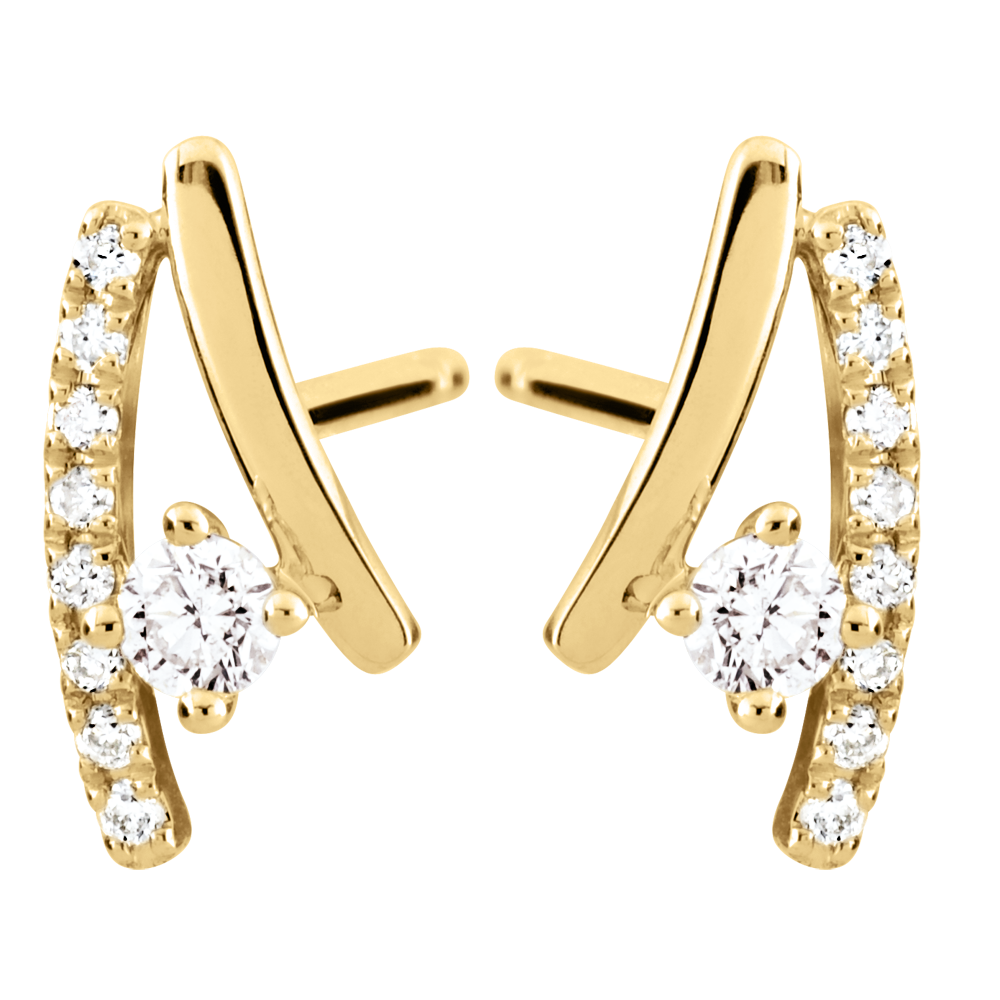 Deux mouvements précieux d'or et diamants enserrent un diamant. Un duo de puces qui allient élégance et originalité avec discrétion.