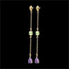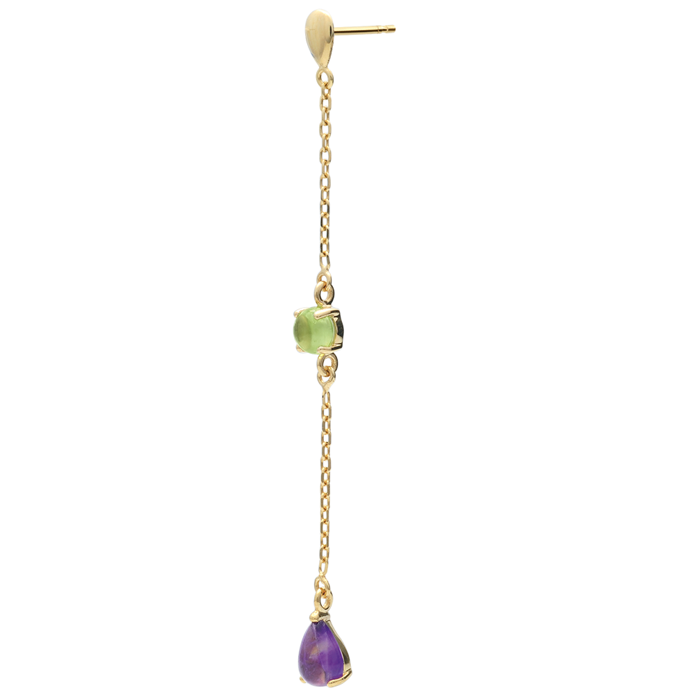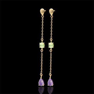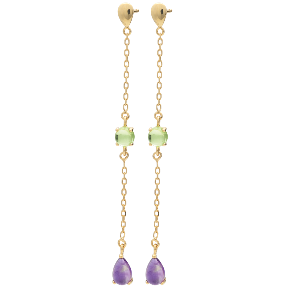 Entre Moyen-Âge et XXIème siècle, ces boucles d'oreilles parées de pierres fines semblent avoir l'intemporalité de l'or et de l'élégance des femmes. Or jaune (9 carats = 375/1000): 1 g. Améthyste : 2 - Peridot : 2 - Total: 1.73 carat Plus dimensions