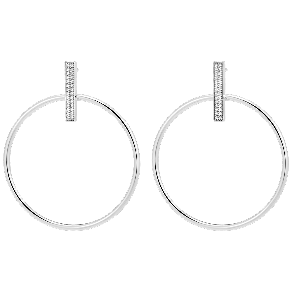 Une paire de boucles d'oreilles pendantes en or blanc où une élégante barrette pavée de diamants sert de point d'ancrage à un cercle d'or pur et délicat. Un jeu subtil de suspension et de lumière pour une sophistication discrète.…