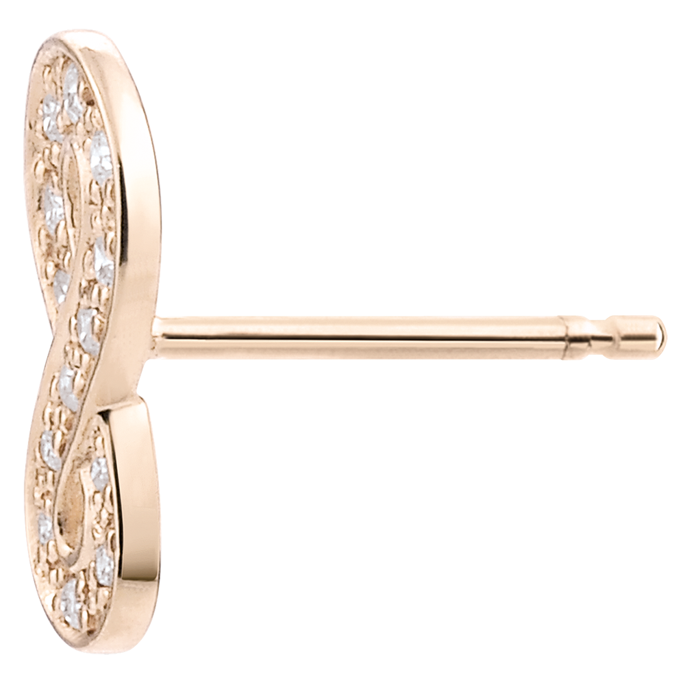 Un signe infini en or rose serti de diamants est monté en puces. Il est le symbole d'éternité absolu.