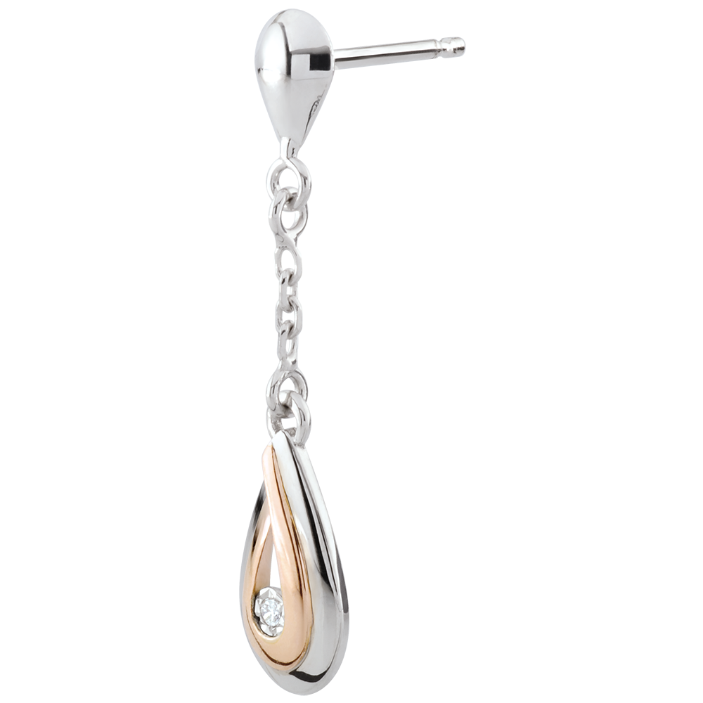 Deux gouttes magiques d'or rose et d'or blanc ornées d'un diamant sont suspendues à un lien délicat.
