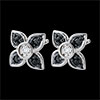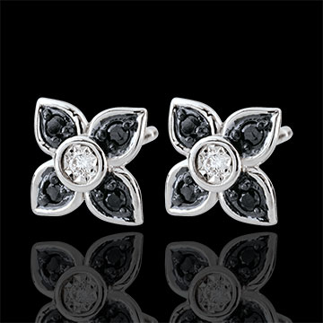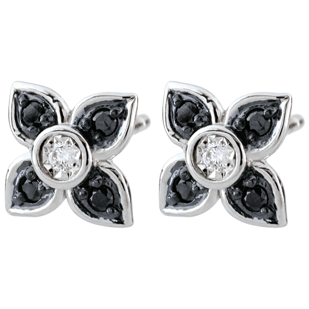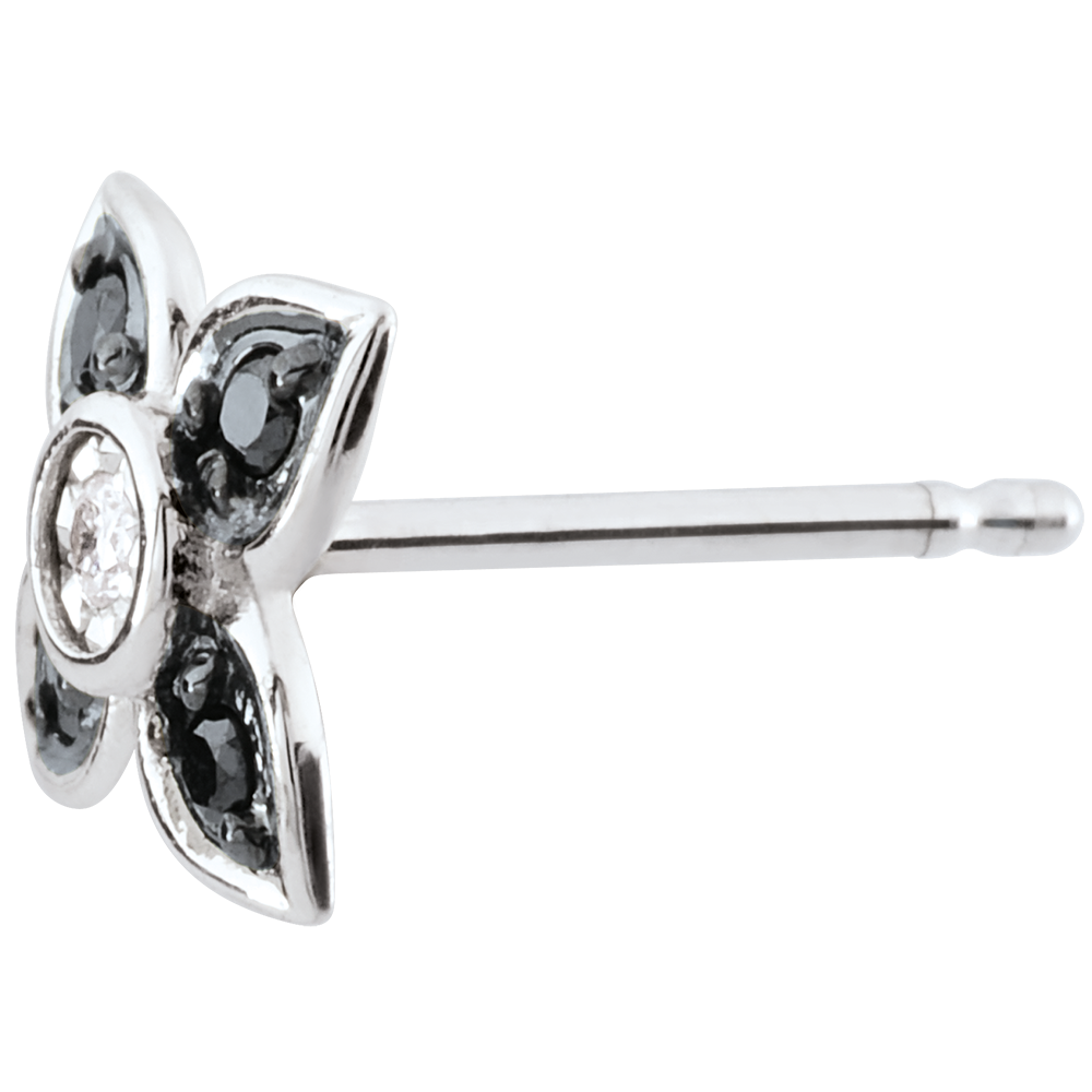 Une fleur aux pétales noires exhibe un coeur de diamant blanc. 2 diamants : 0.02 carat - Or blanc (9 carats = 375/1000): 0.6 g. Diamant noir : 8 - Total: 0.056 carat Plus dimensions