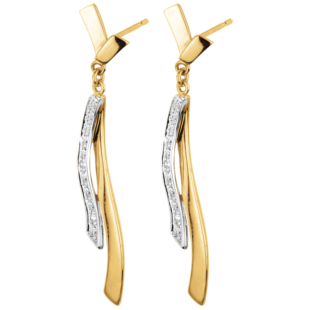 Un ruban pavé de diamants vient se poser sur un second ruban d'or jaune pour des boucles d'oreilles pendantes légères et féminines.