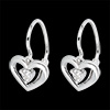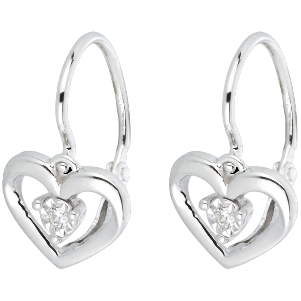 un diamant lové dans un petit coeur de finesse pour chacune de ses boucles d'oreilles en or blanc. Modèle dormeuses.